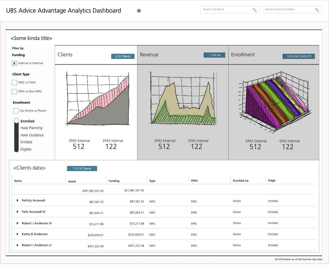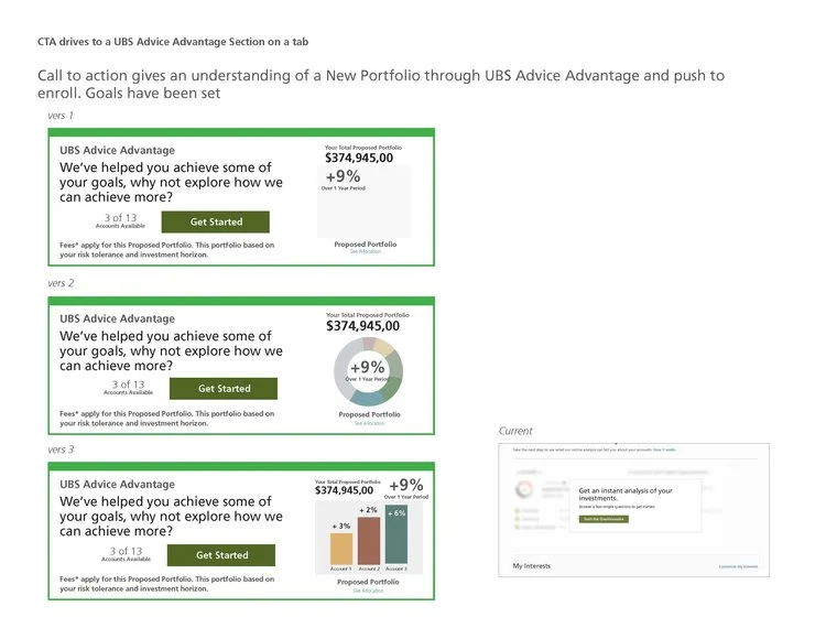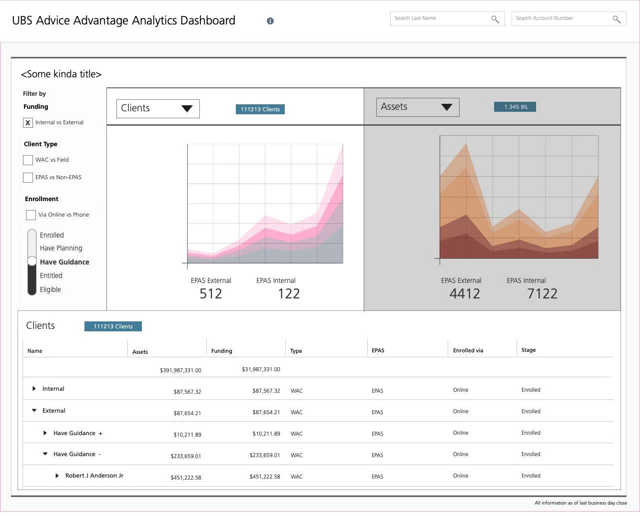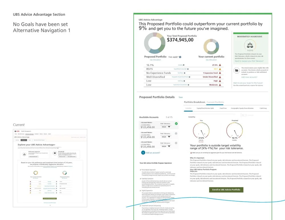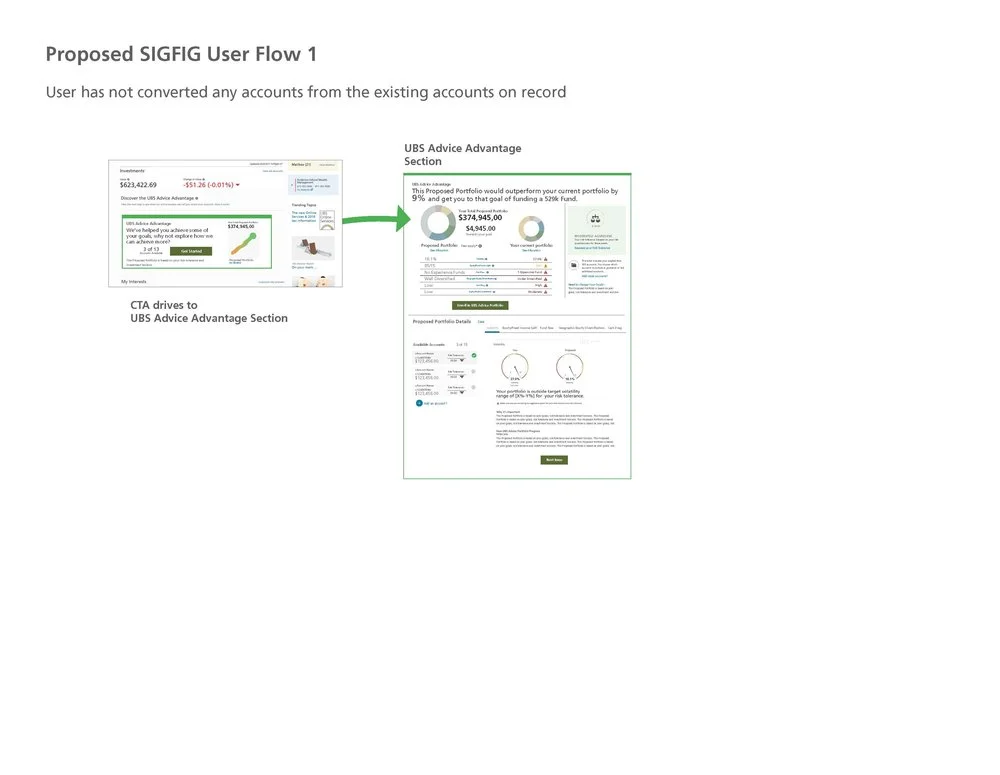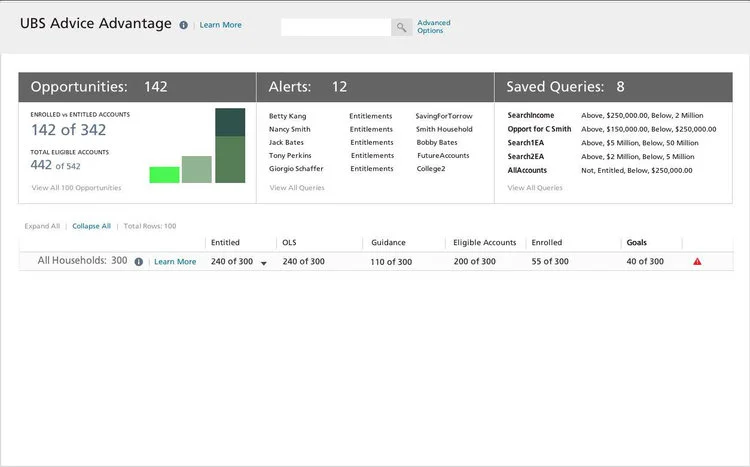 The DAP Dashboard Experience allows FAs and CSAs to entitle any of their clients they feel would benefit from enrollment onto the UBS Advice Advantage Program. A User can search and find clients, understand a client's relationship to a household, and related clients, understand accounts related to a client, entitle any client they feel would benefit. The Field SigFig MVP will require a new set of pages to display UBS Advice Advantage details to the Field and Home Office users. Existing ConsultWorks applications may need to be modified to be a part of the Advice Advantage process. UBS Advice Advantage is UBS’s first platform designed with SigFig, an independent San Francisco-based wealth management technology company. The firms worked closely together to integrate the service within the UBS Online Services client website. The platform was also customized to incorporate UBS research and market views in the diagnostics and portfolio construction. We saw an opportunity to enhance the advisor-client relationship with an innovative product that meets our clients’ needs and maintains the critical elements and trust we have cultivated over decades.