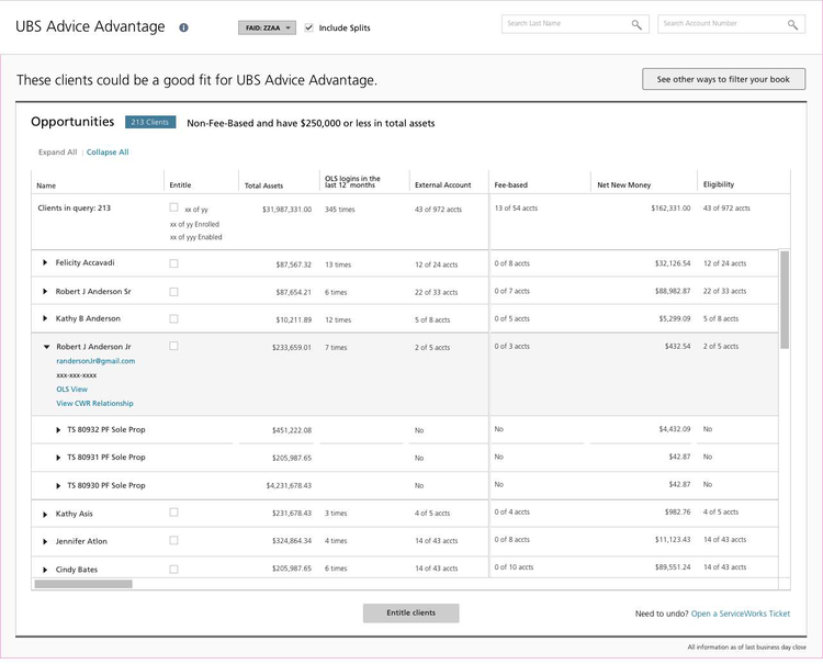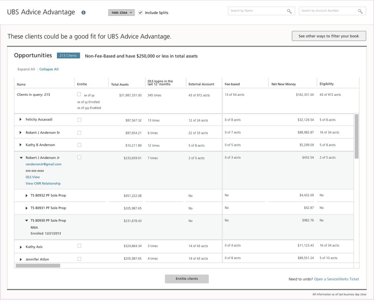 Financial analysts need a place to understand and entitle their affluent clients who would be eligible for the UBS Advice Advantage platform and its services.