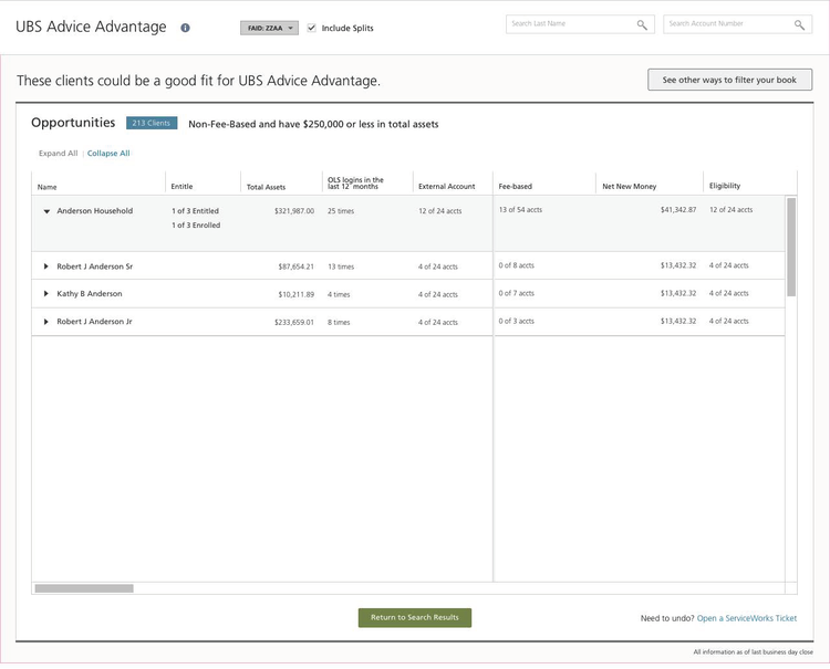 The DAP Dashboard Experience allows FAs and CSAs to entitle any of their clients they feel would benefit from enrollment onto the UBS Advice Advantage Program. A User can search and find clients, understand a clients relationship to a household, and related clients, understand accounts related to a client, entitle any client they feel would benefit. The Field SigFig MVP will require a new set of pages to display UBS Advice Advantage details to the Field and Home Office users. Existing ConsultWorks applications may need to be modified in order to be a part of the Advice Advantage process.